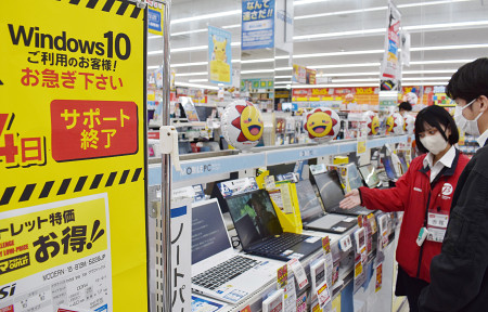 米マイクロソフトはパソコン基本ソフト「ウィンドウズ10」のサポートを14日で終了する。写真は同日、ウィンドウズ10のサポート終了を知らせる家電量販店「コジマ×ビックカメラ足立加平店」のパソコン売り場。 【時事通信社】
