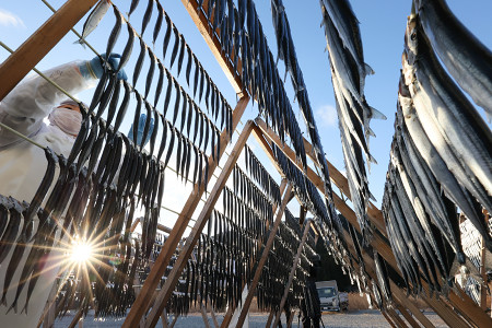 日本有数のサンマの水揚げ量を誇る宮城県女川町で14日、冬の風物詩「サンマの天日干し」が始まった。同町の水産加工会社「ヤマホンベイフーズ」では、特製の塩だれに一晩漬け込んだサンマが手際よく干されていった 【時事通信社】