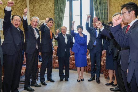 衆院解散を受けて与野党は23日、真冬の「超短期決戦」に事実上突入した。通常国会冒頭の解散は60年ぶり。写真は、解散後のあいさつ回りで自民党幹部と気勢を上げる高市早苗首相(中央右)=同日午後、国会内 【時事通信社】