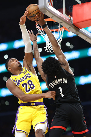 プレーオフの東西両カンファレンス1回戦の第1戦が行われ、八村塁(左)が所属する西カンファレンス第4シードのレーカーズは、本拠地で第5シードのロケッツと対戦し、107―98で快勝=18日、ロサンゼルス 【AFP時事】