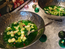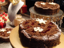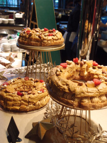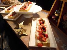 ビュッフェ台には、リング状のシュー生地にプラリネ風味のクリームを挟んだフランスの伝統菓子「パリブレスト」や、アーモンドパウダーやシナモンなどを練り込んだ生地にラズベリージャムを重ねて焼くオーストリアの伝統菓子「リンツァトルテ」をクリスマス用に仕立てたケーキ、イチジクやベリーを盛り付けるフルーツタルト、サンタ帽をモチーフにしたムースなどを並べる。は。セイボリーは日替わりのカレーとスープ、サラダ類など。会場はきらきらと輝くオーナメントやギフトボックスで飾る。