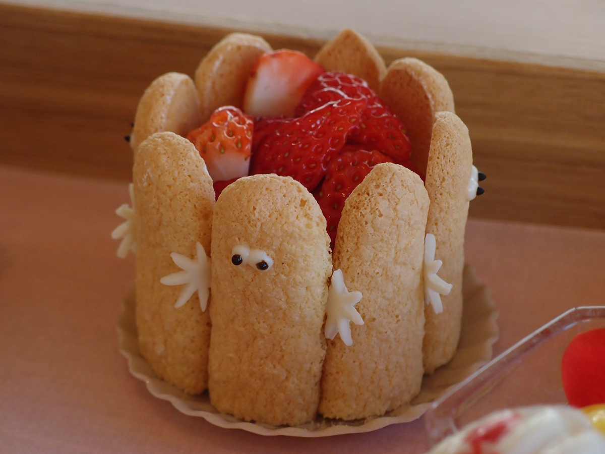 ビスキュイで作った「ニョロニョロ」で囲ったイチゴのシャルロットケーキ