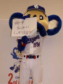 ペンを持ったドアラが、ステージ後方の応援メッセージボードに「あきらめない心!」とエールを書き込むと、大きな拍手が送られた。