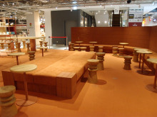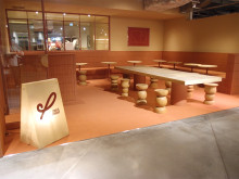 「Phi cream & croissant」の赤土色のカラーリングで統一した空間に大きな円状のメインカウンターを設置する