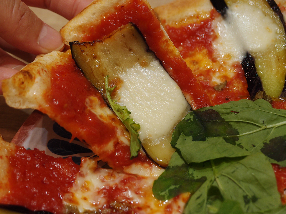薄いクリスピー生地のピザ「揚げナスとモッツァレラ」