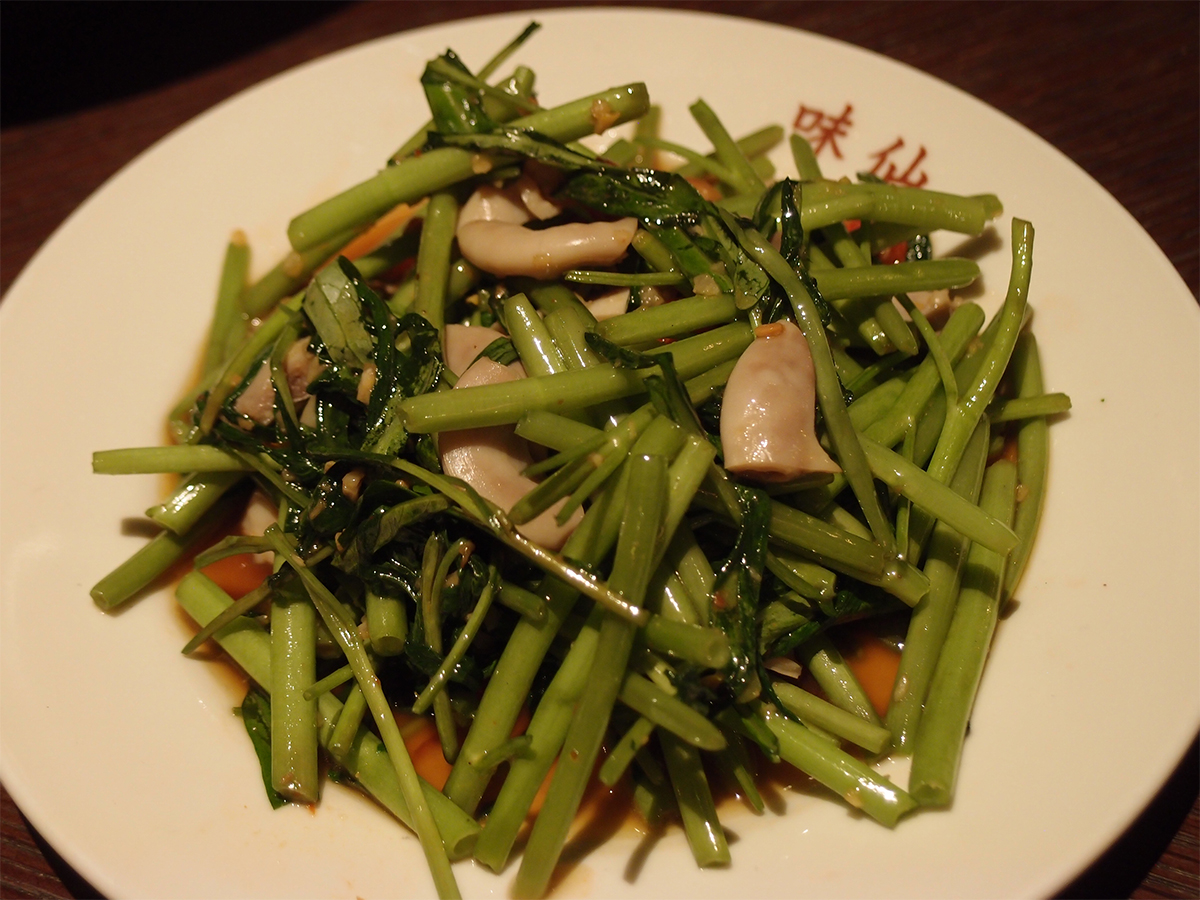 コラボメニュー「虜のコブ青」。矢場味仙の「コブクロ」は冷たい料理だが「虜のコブ青」は香りを出したニンニクで炒めてある温かい料理