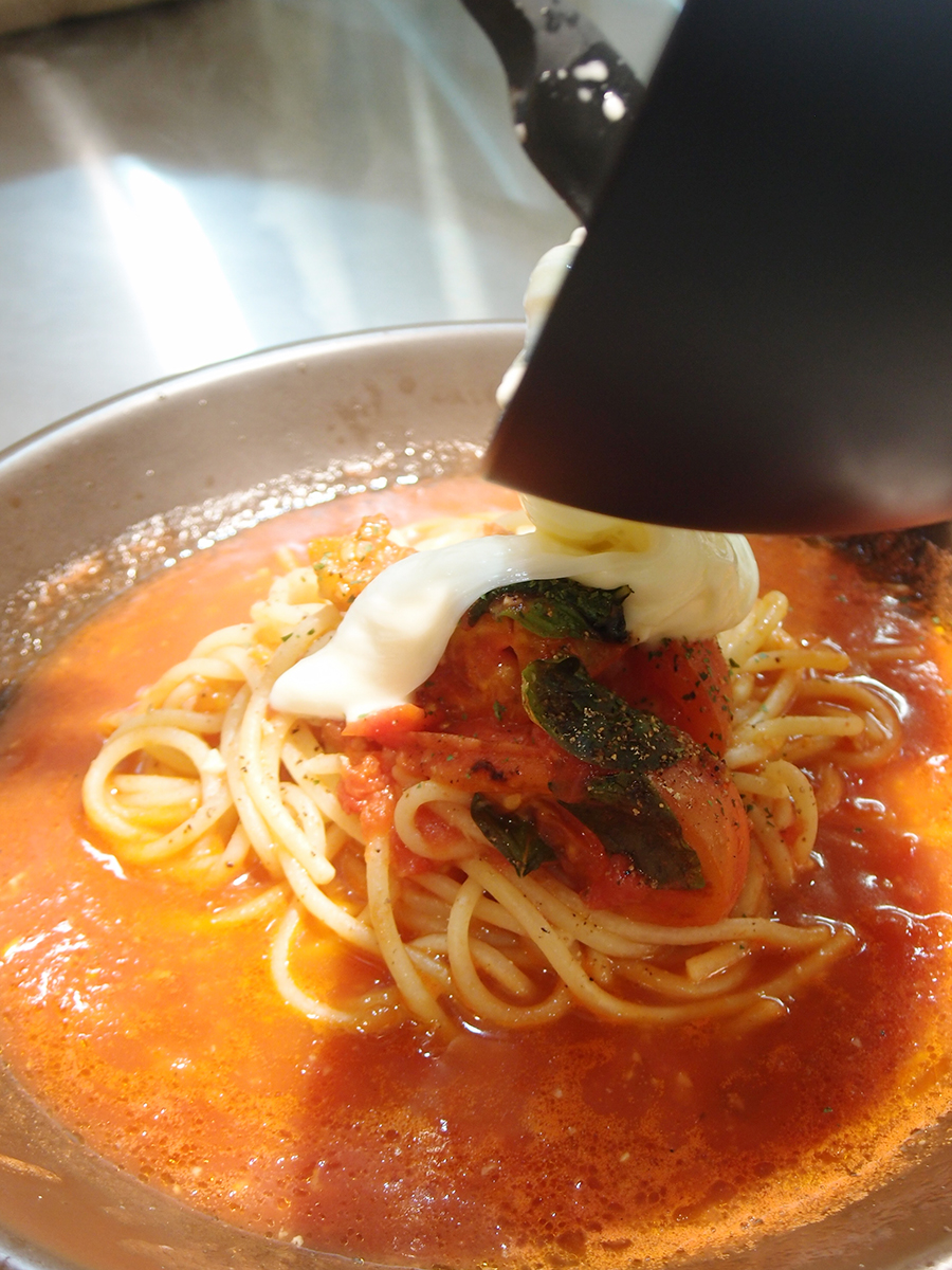目の前でモッツァレラチーズとパルメザンチーズをかけて仕上げる「焼きトマトとのび~るモッツァレラ」