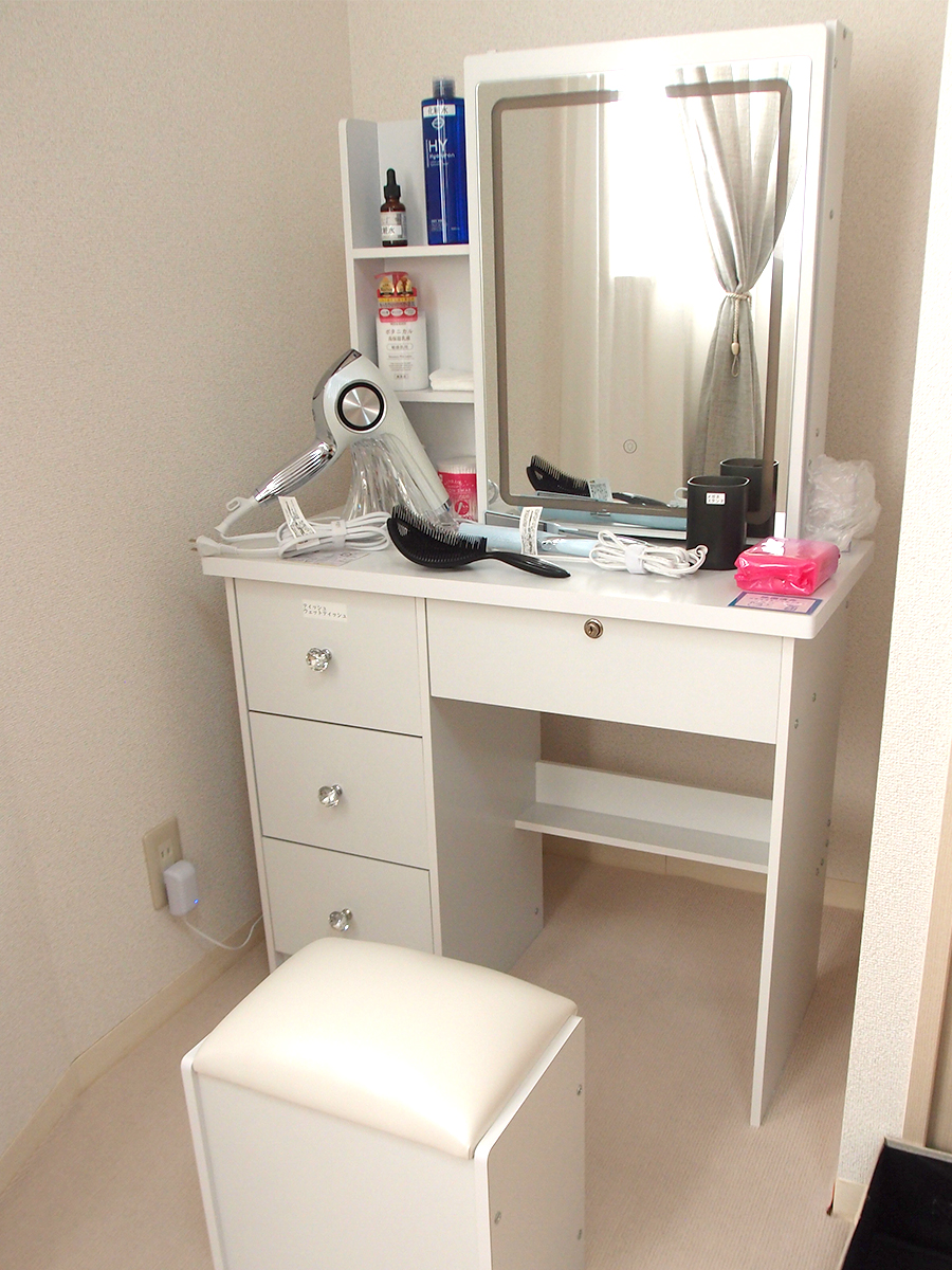 ドライヤー、ヘアブラシ、化粧水、乳液などを設置するドレッサー