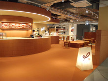 「Phi cream & croissant」の赤土色のカラーリングで統一した空間に大きな円状のメインカウンターを設置する