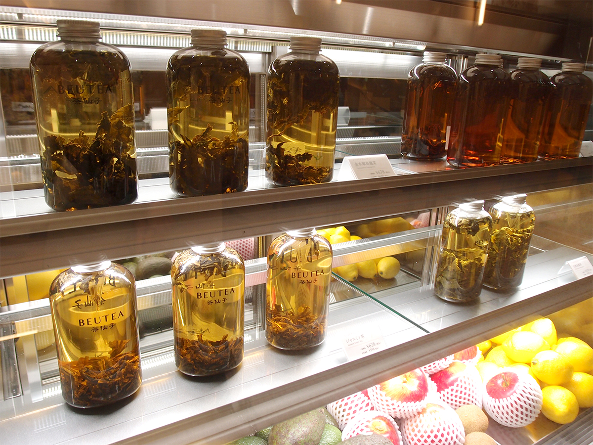 ショーケースに並ぶボトル入りの「BEUTEA」の水出し中国茶