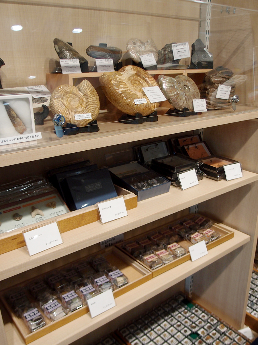 名古屋市科学館ミュージアムショップに並ぶ鉱物・化石標本