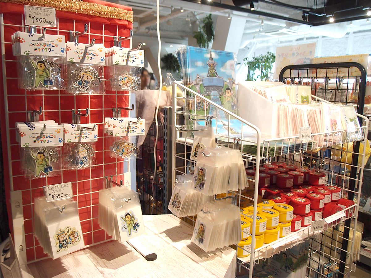 イベント「にゃんともまめこなミライタワー」オリジナルグッズが並ぶ一角