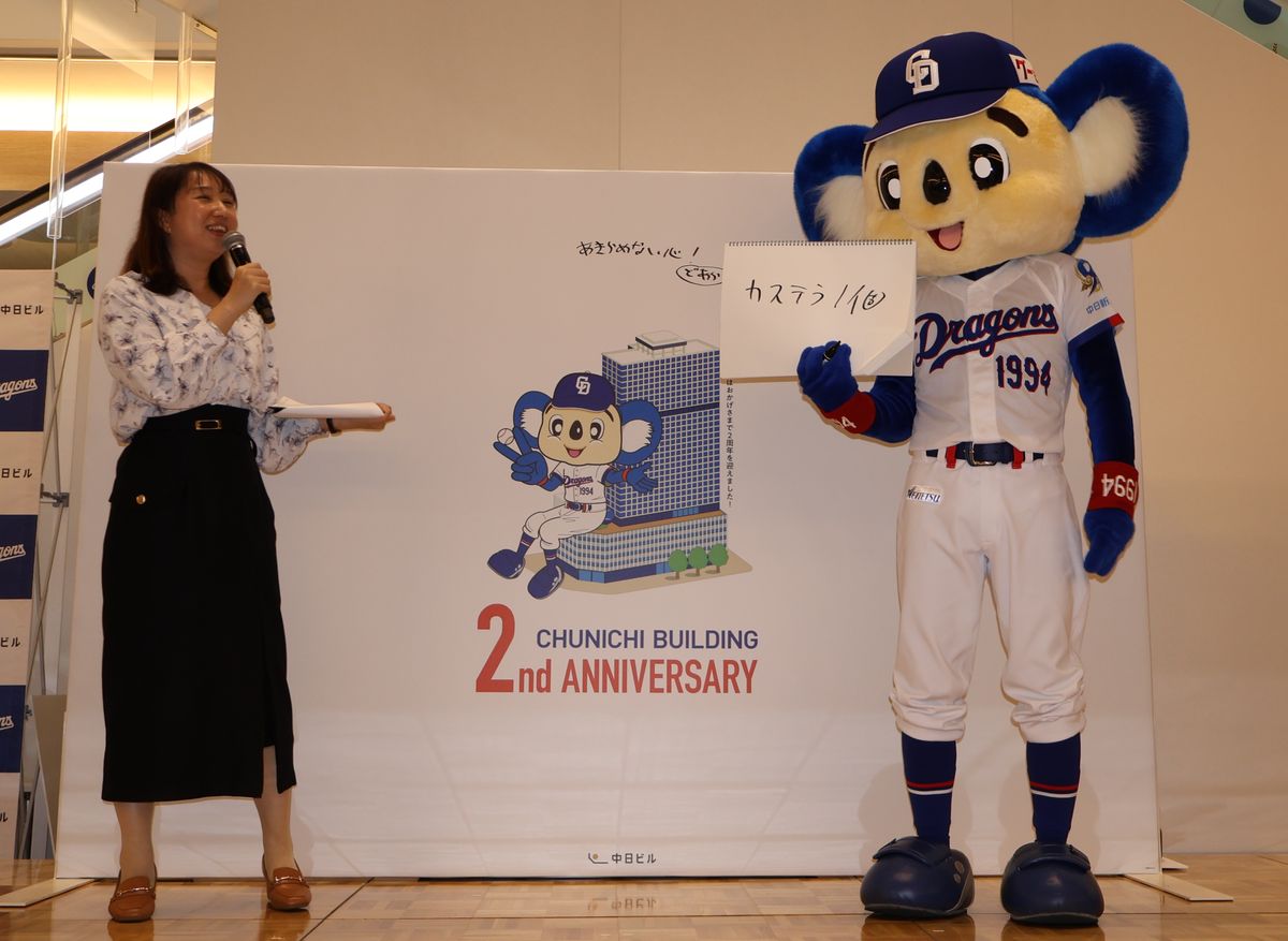 中日ビル2周年のセレモニーを盛り上げるドアラ