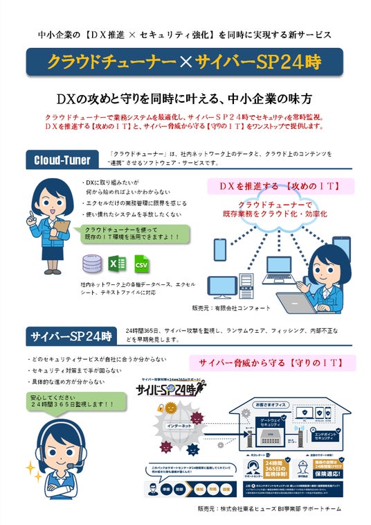 2025年10月、愛知県名古屋市に本社を置く有限会社コンフォート(取締役社長:秋田育紀)と、株式会社東名ヒューズ(代表取締役社長:加藤正広)は、クラウドとオンプレミス環境を安全かつ効率的に連携する組み込み型iPaaSサービス「クラウドチューナー」と、24時間365日企業のセキュリティ体制を支援する「サイバーSP24時」を組み合わせた新たなDX支援サービスの提供を開始しました。
