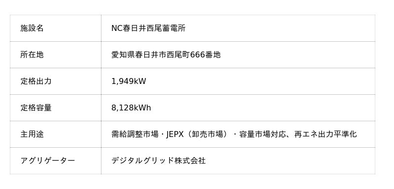 日本蓄電池株式会社(本社:東京都千代田区、代表取締役社長:漆原秀一、以下「日本蓄電池」)、デジタルグリッド株式会社(本社:東京都港区、代表取締役社長CEO:豊田祐介、以下「デジタルグリッド」)は、愛知県春日井市西尾町に建設された第一号の系統用蓄電施設「NC春日井西尾蓄電所」が需給調整市場への参入を開始したことをお知らせいたします。