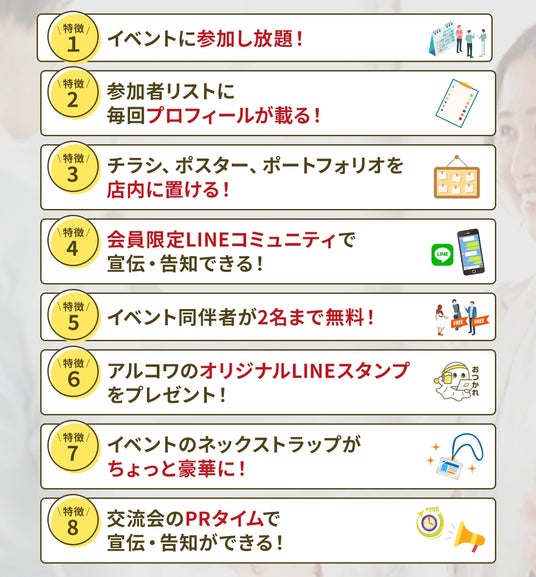 アルコワ会員は、定額でイベントに参加できたり、自分の活動を知ってもらうのに効果的な特別プランです。