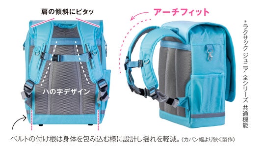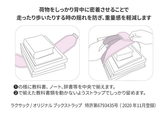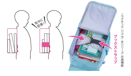 ラクサックシリーズは、背負った際に「軽く感じる」工夫が随所に施されているのが特徴です。特許技術を活かした「ブックストラップ」は、登山用バックパックの構造を参考に開発され、重い教科書類を背中にしっかり固定することで、より軽く感じられる効果が期待できます。