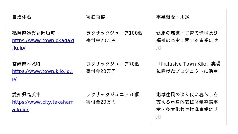 フットマーク株式会社(本社:東京都墨田区、代表取締役社長:磯部徳史)は、創業80周年記念事業の一環として、地域社会への貢献活動を目的に、布製ランドセル「ラクサックジュニア」と寄付金を3つの自治体へ寄贈しました。