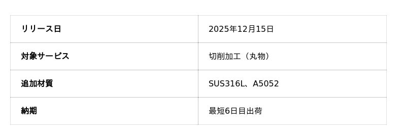 機械部品調達のAIプラットフォーム「meviy(メビー)」(サービス提供元:株式会社ミスミグループ本社)は、2025年12月15日より、切削加工(丸物) (以下、切削丸物)において、耐腐食性・耐熱性に優れたステンレス鋼である「SUS316L」と、汎用性の高いアルミニウム材「A5052」の2種類の提供を開始しました。これにより、医療・食品・半導体のほか、様々な業界の幅広い設計ニーズに対応します。