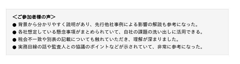 企業の検討が本格化する1~3月の重要な時期に合わせて、すでに会計論点整理まで完了している先行事例やIFRS第16号対応における100社超の実績、さらには累計2万名超が参加したセミナー開催で培った知見を活かし、網羅的なテーマで企業の検討を支援してまいります。