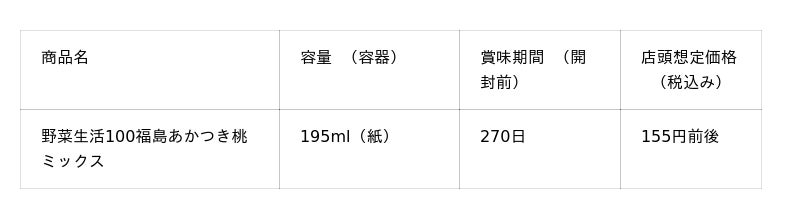 「野菜生活100季節限定シリーズ」から新たに発売する「野菜生活100福島あかつき桃ミックス」は、福島県の昼夜の寒暖差の中で育つ、しっかりとした甘さと程よい酸味の福島県産のあかつき桃の味わいの野菜・果実100%ミックスジュース※1です。あかつきの名前の由来は、果皮の美しい赤色と、福島の桃の中では早期に収穫できることから「夜明け」という意味を込めて名付けられた説と、福島の伝統行事のひとつである「信夫三山暁まいり」に由来している説などがあります。砂糖不使用で、たっぷりビタミンCを摂ることができます。朝食のおともや、リフレッシュしたいときにおすすめです。
