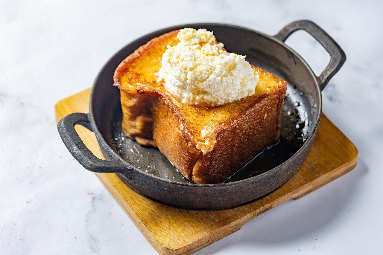 ベースとなるフレンチトーストは、12時間じっくりと卵液を染み込ませた超厚切りブリオッシュを使用。表面は香ばしく、中はスプーンが沈み込むほどの“飲める”ふわとろ食感に焼き上げました。