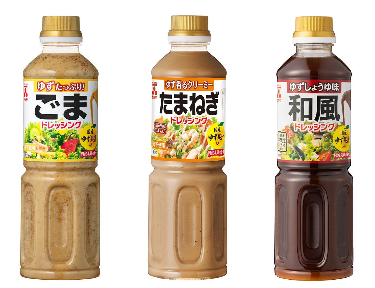 写真左から 「ごまドレッシング ゆず果汁入り」 「ゆず香るクリーミー たまねぎドレッシング」 「ゆずしょうゆ味 和風ドレッシング」