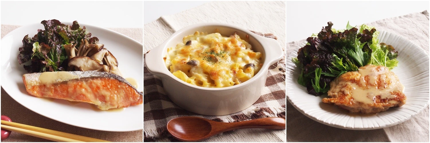 調理例:左から「鮭のムニエル」「マカロニグラタン」「チキンソテー」