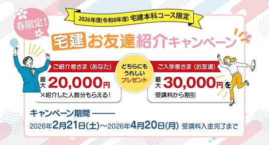 資格取得支援スクールの日建学院を運営する株式会社建築資料研究社(所在地:東京都豊島区、代表取締役社長:馬場栄一)は、2026年度(令和8年度)に宅地建物取引士試験を受験される方向けに春限定の「宅建 お友達紹介キャンペーン」を実施いたします。紹介いただいた方が2026年度(令和8年度)宅建本科コースにご入学すると、ご紹介者・ご入学者それぞれにお得な特典をプレゼントいたします。