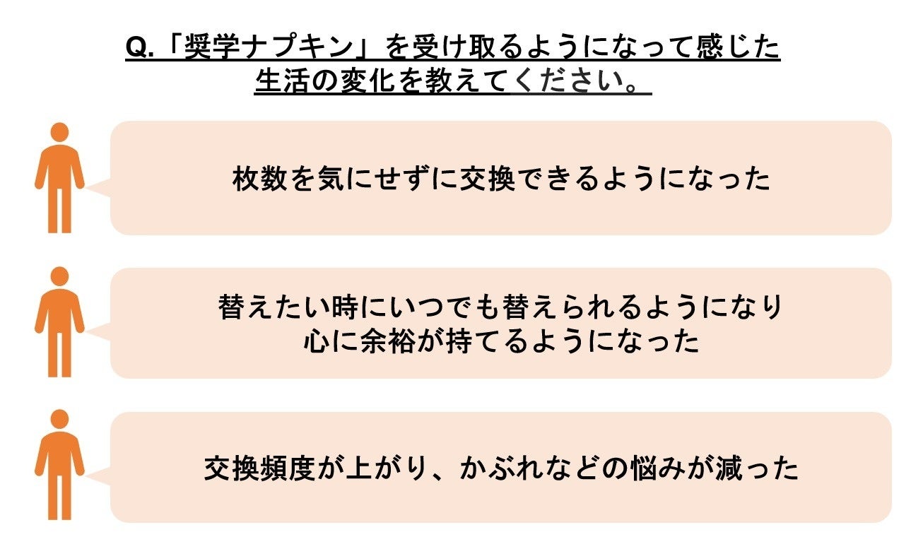ナプキンを受け取り始めてから多くの奨学生が「ナプキンの交換頻度が上がった」と回答。「枚数を気にせずに交換できるようになった」「替えたい時にいつでも替えられるようになり心に余裕が持てるようになった」など、前向きな声が挙がりました。さらに、「交換頻度が上がり、かぶれなどの悩みが減った」「かぶれ、においもなく快適に過ごしています」など、交換頻度の改善から肌悩みの軽減にもつながっていることがうかがえます。