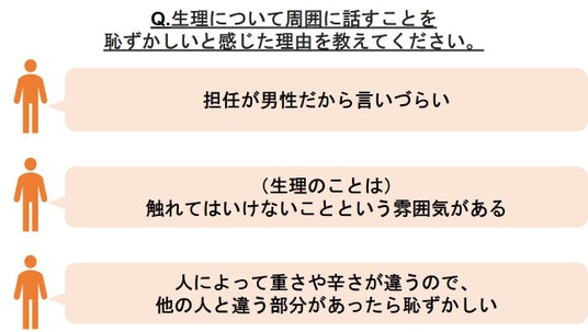 生理について「周囲に話すことを恥ずかしいと感じたことがあるか」という問いに対し、59.7%が「はい」と回答。恥ずかしいと感じる理由として、「男性がいる時は話さない」「担任が男性だから言いづらい」といった異性に対しての話しづらさのほか、「体に関するデリケートな話題」「(生理のことは)触れてはいけないことという雰囲気がある」などデリケートな話題としての認識、「人によって重さや辛さが違うので、他の人と違う部分があったら恥ずかしい」などの個人差への不安が主な要因として挙げられました。