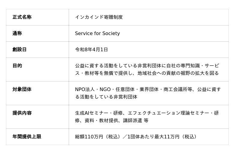 当社はこれまで、東海地域を中心に中小企業・商工会議所・業界団体等に対して生成AI活用支援や経営コンサルティングを提供してまいりました。その中で、「支援を必要としているが運営規則や費用の制約で導入できない」という非営利団体からの声を多くいただいてきました。