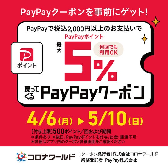 コロナワールド各施設でのお支払いがもっとお得に!PayPayアプリ内で事前にクーポンを獲得し、税込2,000円以上お支払いいただくと、最大5%のPayPayポイントが戻ってきます。