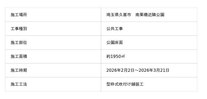 景観コンクリート舗装材の専門メーカーである株式会社MAT(本社:名古屋市緑区、代表:吉川貴祥/近藤洋一)は、埼玉県久喜市が発注した公園整備工事において、同社の主力商品「マットスプレー」を用いた床面施工を実施しました。