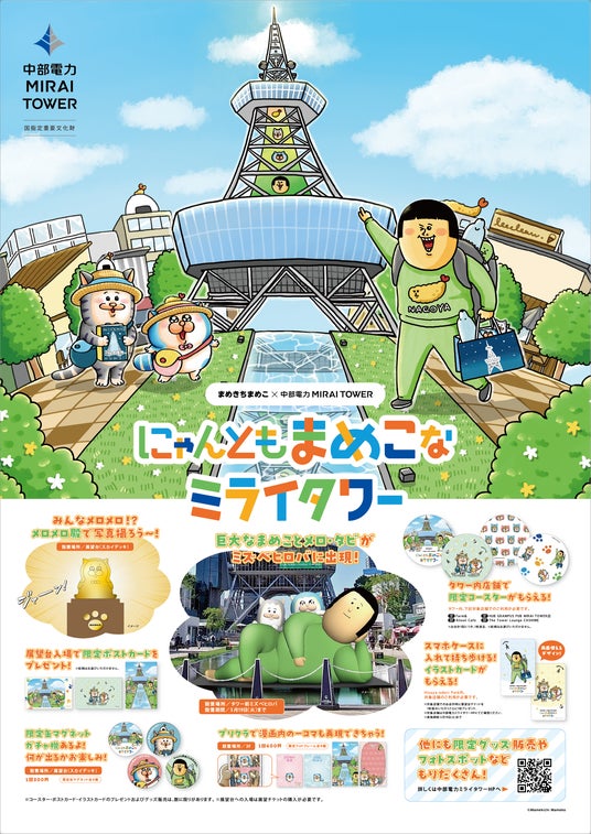 中部電力 MIRAI TOWER (所在地:愛知県名古屋市、運営:名古屋テレビ塔株式会社)では、4月22日(水)より大人気漫画家まめきちまめこさんとの特別コラボイベント「にゃんともまめこなミライタワー」の開催を予定しています。この度、Hisaya-odori Parkとの連動キャンペーンが新たに決定しましたのでご案内します。また、グッズショップで販売するオリジナルグッズの詳細についても公開します。